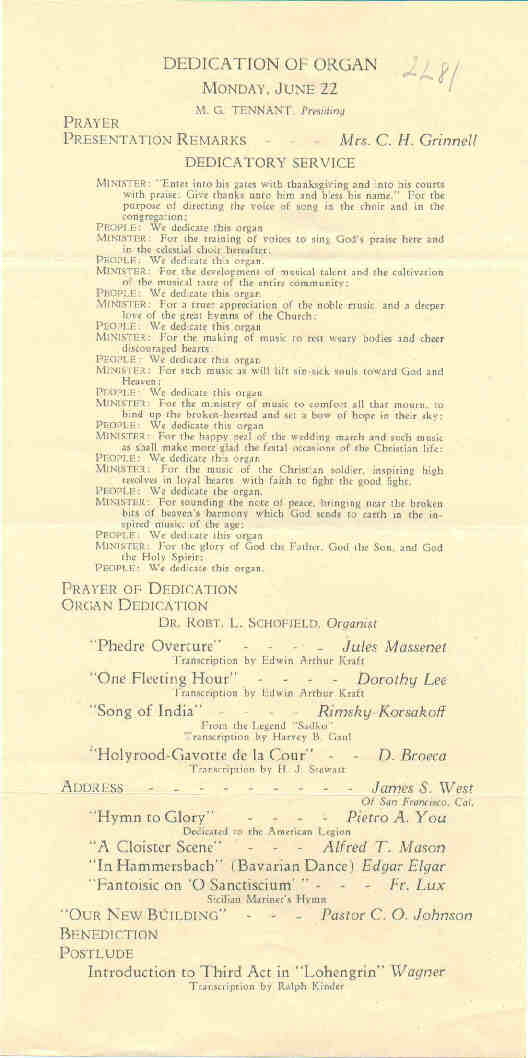 An 8' Trumpet was installed in the Choir in place of the original 8' Clarinet as a memorial. In the Pedal,