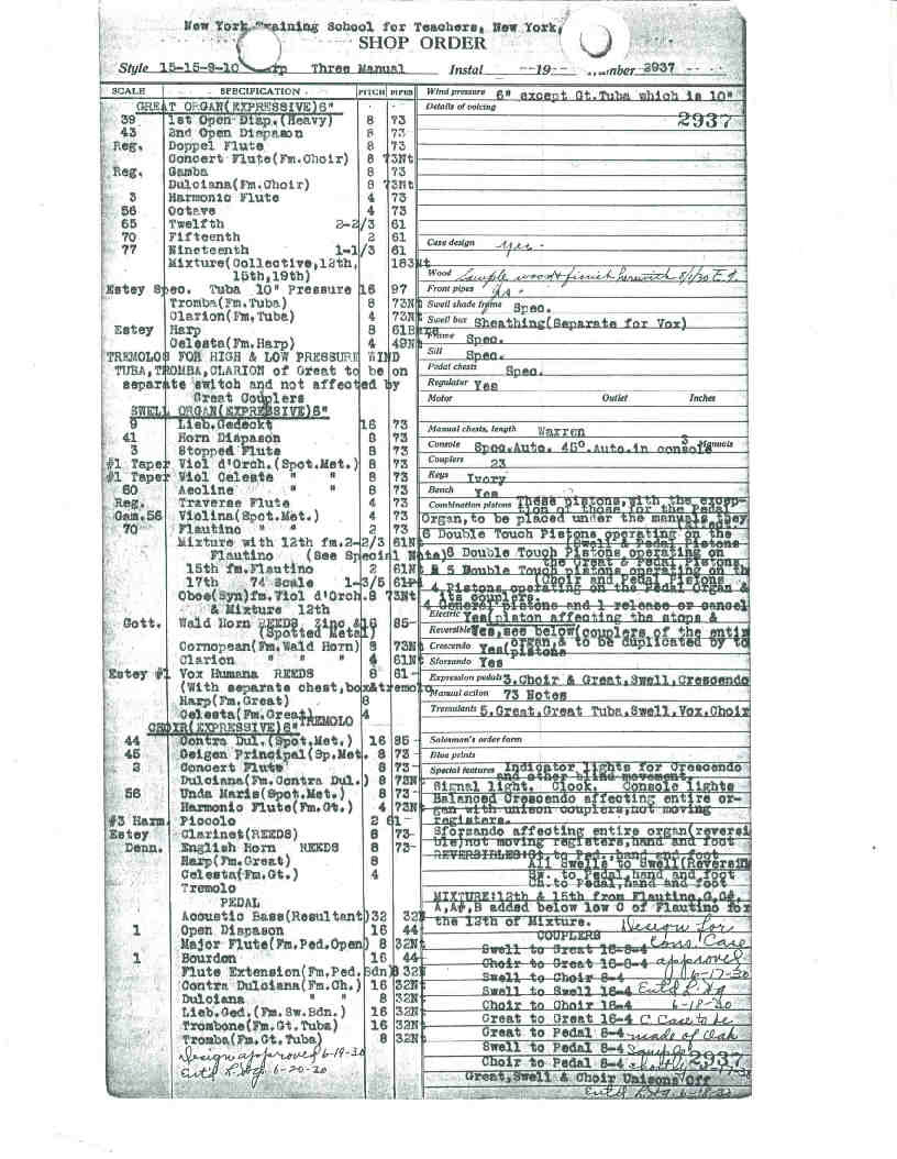 The annual sum involved in the contract is $168,000, making the cost of the seven organs average approximately $24,000 each. The specifications call for instruments identically alike for each of the seven schools, and each organ is to be equipped with automatic player. The contract, finally signed this month, calls for delivery of the organs within one year from date. When these seven Estey organs are installed, New York City schools will have embarked on a program of musical education and appreciation with organ equipment which will outrank that of any other city in the Country, but this is only a beginning of the program. Additional appropriations have been made for still further use of the pipe organ in the large high schools of the city, giving a permanent recognition to the importance of the pipe organ in school music Courses. That the Estey instrument should be the choice of New York City experts both on the score of price and quality after six months of careful consideration, is a matter of interest and importance to other municipalities which may be considering organs for school purposes. |
