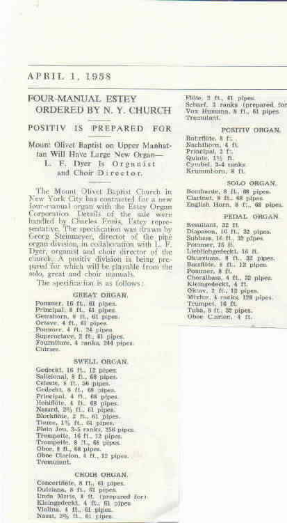 Choir 8 Concert Flote 8 Dulciana II Unda Maris (prep.) 4 Kleingedeckt 4 Violina 2 2/3 Nasat 2 Flote III Scharf (prep.) 8 Vox Humana Tremolo Positiv (prepared for) 8 Rohrflote 4 Nachthorn 2 Principal 1 1/3 Quinte III-IV Cymbal 8 Krummhorn Tremolo Pedal 32 Resultant 16 Diapason 16 Subbass 16 Pommer 16 Lieblich Gedeckt 8 Octavbass 8 Pommer 4 Choralbass 4 Kliengedeckt 2 Octav IV Mixture 16 Trumpet 8 Tuba 4 Oboe Clarion |